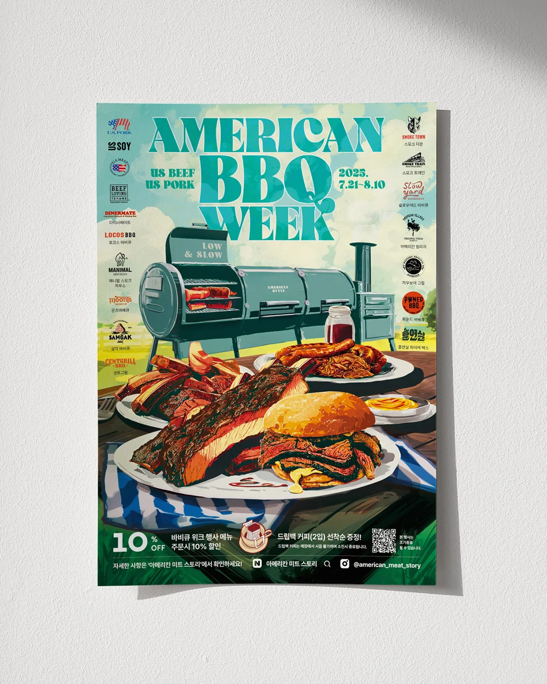 As an event hosted by the U.S. Meat Export Federation, this key visual poster was designed to intuitively convey the spirit of American barbecue culture by capturing an outdoor BBQ scene as a single, cohesive moment.