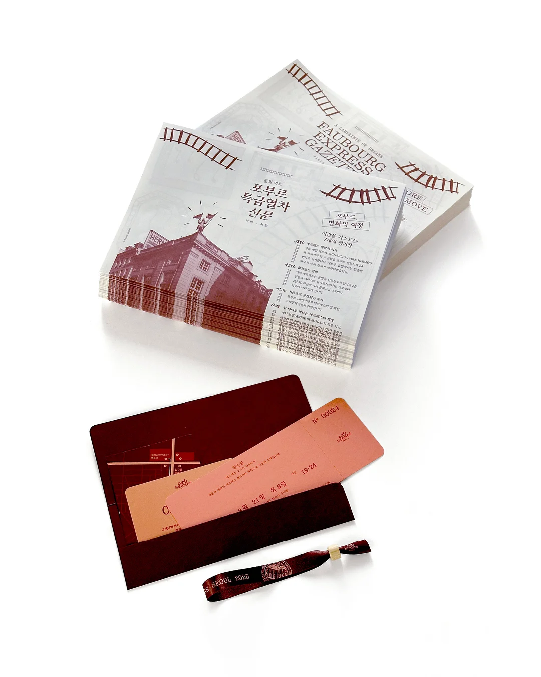 Hermès “Faubourg” event materials, including invitations, bracelets, and newspapers.